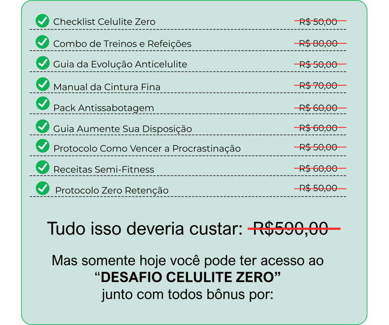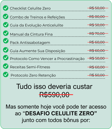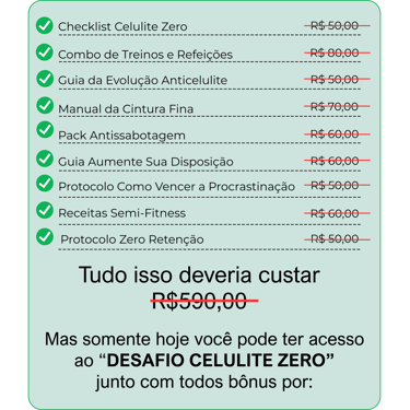 Você vai receber um checklist de ações rápidas e simples que vai te ajudar a aplicar seu protocolo e eliminar a celulite em 21 dias.